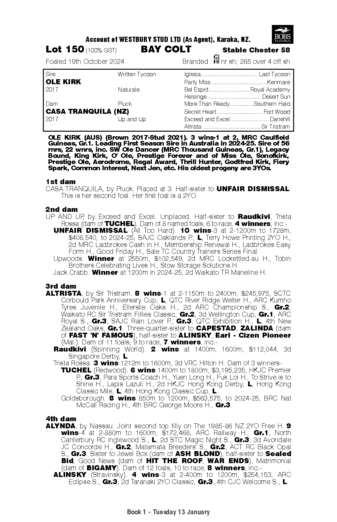 We believe this OLE KIRK x CASA TRANQUILA (NZ) Bay Colt is exactly the type of horse our clients want to race: athletic, well bred, professionally selected and placed in the right hands from day one.