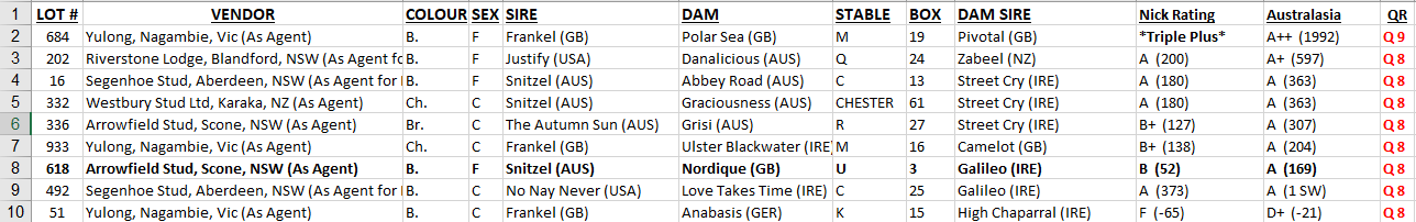 In the high majority of cases, Lot numbers in a sale run in the alphabetical order of the 1st Dam (mother’s) name. The catalogue starts with a random letter of the alphabet and rolls through in alphabetical order.