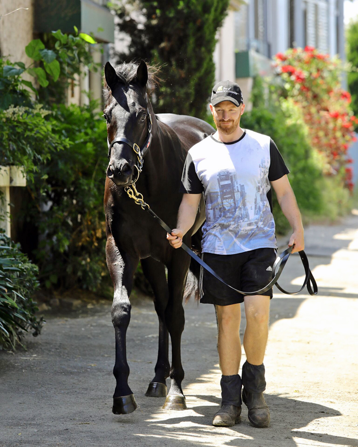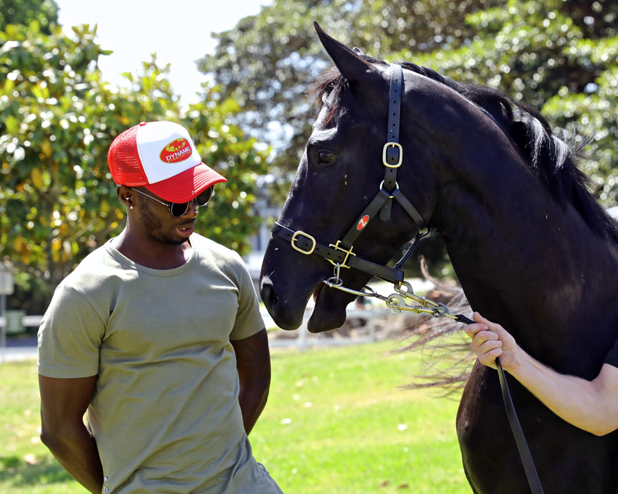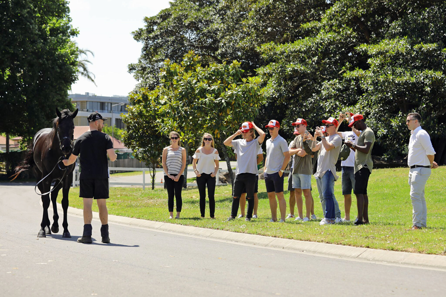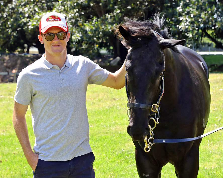 Adam Watt of Dynamic Syndications at Gai Waterhouse’s stables on Randwick Racecourse, to be personally introduced to their equine Adonis.