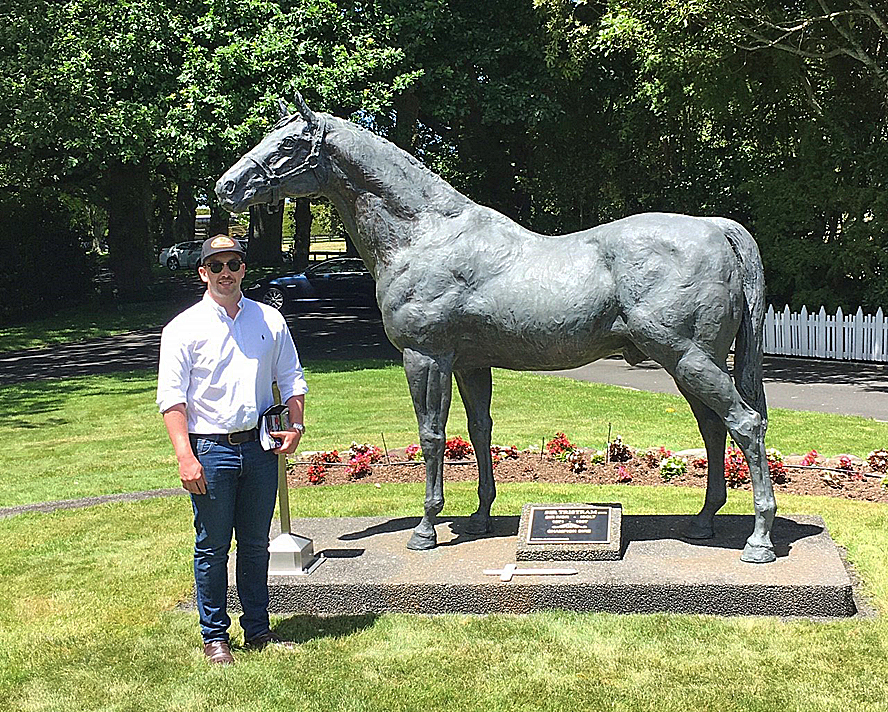 Adam @ Cambridge Stud with statue of legendary Sir Tristram