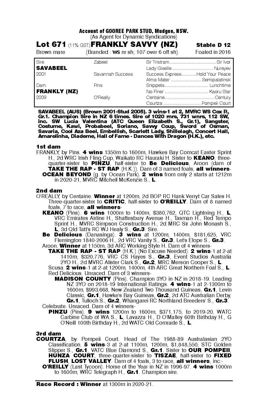 FRANKLY SAVVY’S 3rd Dam is champion mare COURTZA. So as now a lightly raced