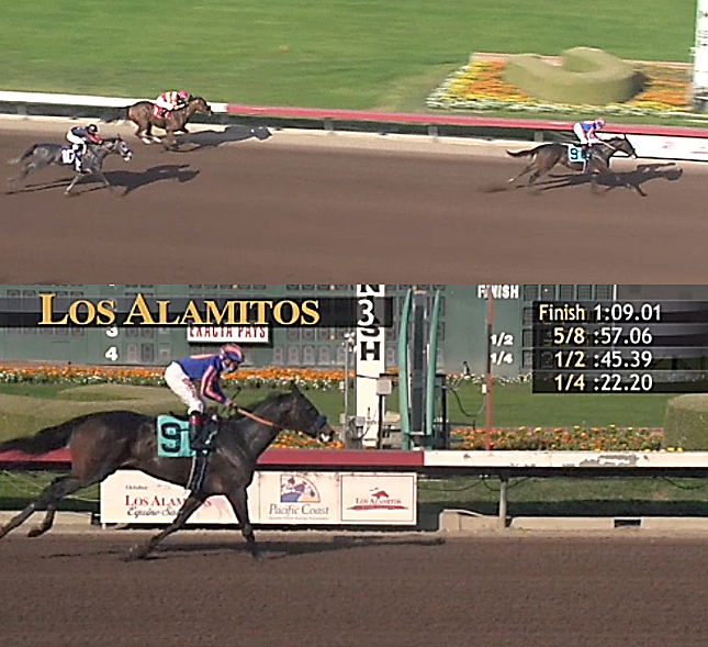 He jumped evenly and sat beside the pickets travelling in fourth spot behind the leaders and when urged to take an inside gap on straightening, he lengthened stride in the same manner as his sire was noted to do, impressively winning by a widening length and a quarter.