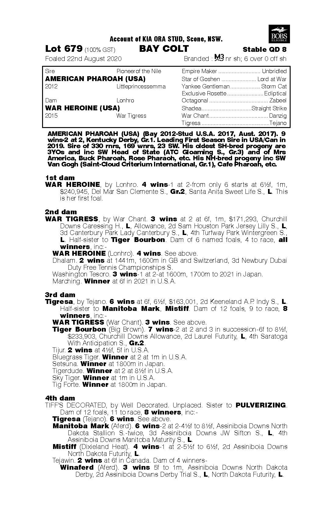 KENTUCKY PHAROAH (18c, Strut the Stage, Trajectory). 2 wins at 1600m, A$132,906, 1st Gulfstream Park Dania Beach S., L, 4th Del Mar Wickerr S., L