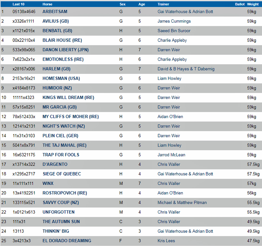 Other notable acceptors include Avilius (James Cummings), last weekend’s New Zealand Group 1 winner Savvy Coup (Mike Pittman) and 2017 runner-up Humidor (Weir) – one of six acceptors from the Darren Weir yard. Waller has four acceptors remaining and Waterhouse & Bott have three still in the field.