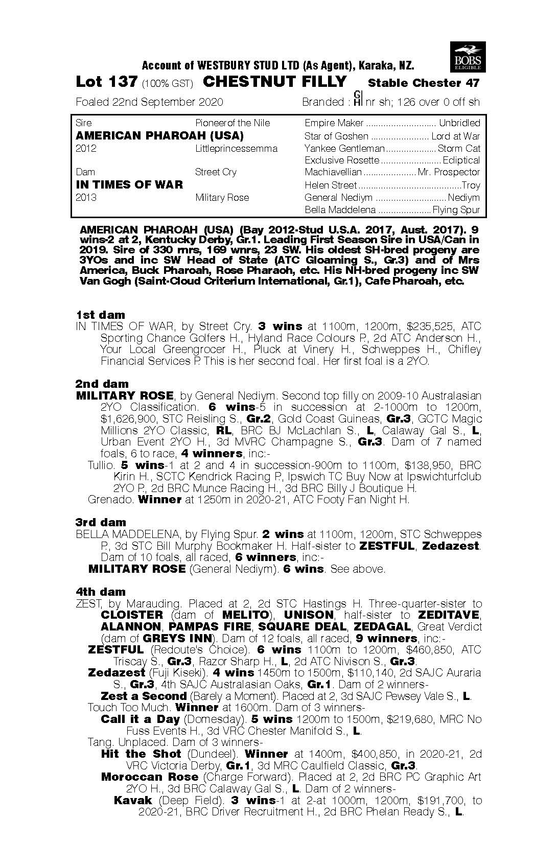 We purchased a filly ex IN TIMES OF WAR - a 3-time winning daughter of STREET CRY ex MILITARY ROSE (Magic Millions Winner) going to Ciaron Maher & David Eustace