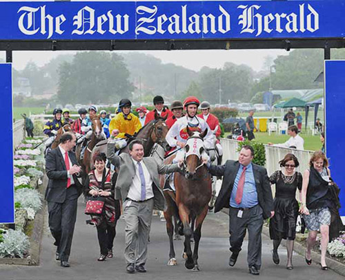 Dean Watt celebrating with Nash Rawiller and owners following Tommy's Railway Stakes win