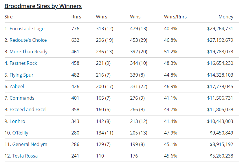Below is a table of the Australian Top 12 Broodmare Sires by Earnings and Winners