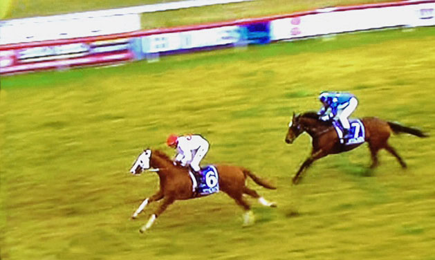 Balancing up, Dettori was just 2 horses off the outside fence, giving the heavily backed favourite Henny Fusaichi some 3 lengths start. However in a few strides, Dettori ranged up to eye ball the favourite and for the next 50m the pair fought a good tussle before Dettori dug deeper and drew away from favourite to be eased down and record a dominant 1 ¾ length x 4 ¼ length victory.