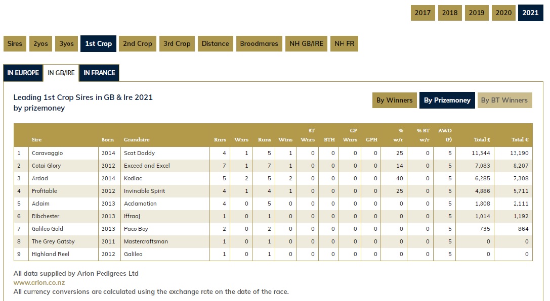 currently leads the First Crop Sires by Earnings in England/Ireland.