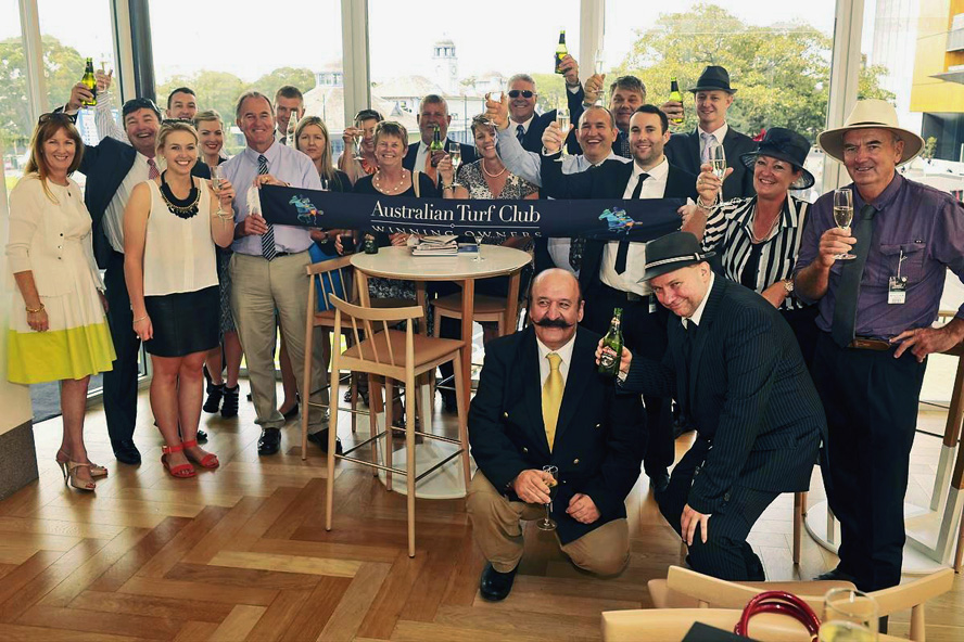 STEPHEN KOUKOULAS (back row with champagne!) Winners Room - Randwick