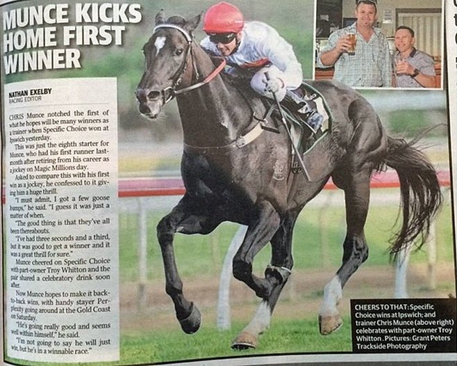 "Dynamic Syndications sent two horses to me from Sydney to Munce’s stables, Specific Choice and Perplexity.