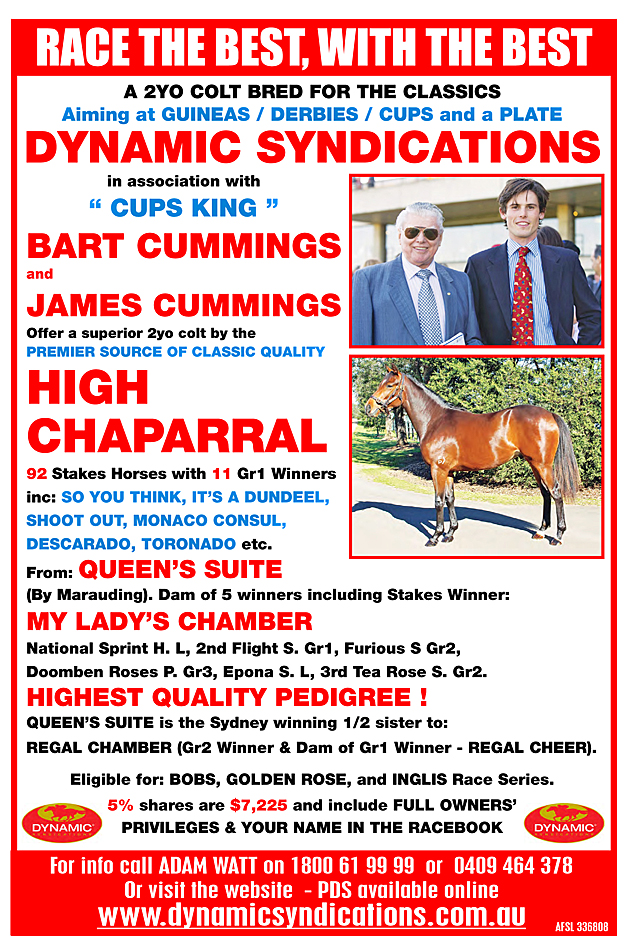 Bart Cummings has won 5 Cox Plates – 2 with SO YOU THINK (by High Chaparral) the same sire as our colt.