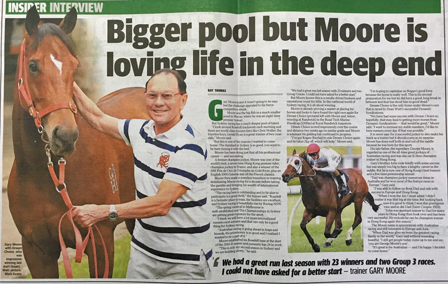 Moore then made a seamless transition to training, dominating Macau racing for a decade before taking the gamble and bringing his wealth of international experience to Sydney.