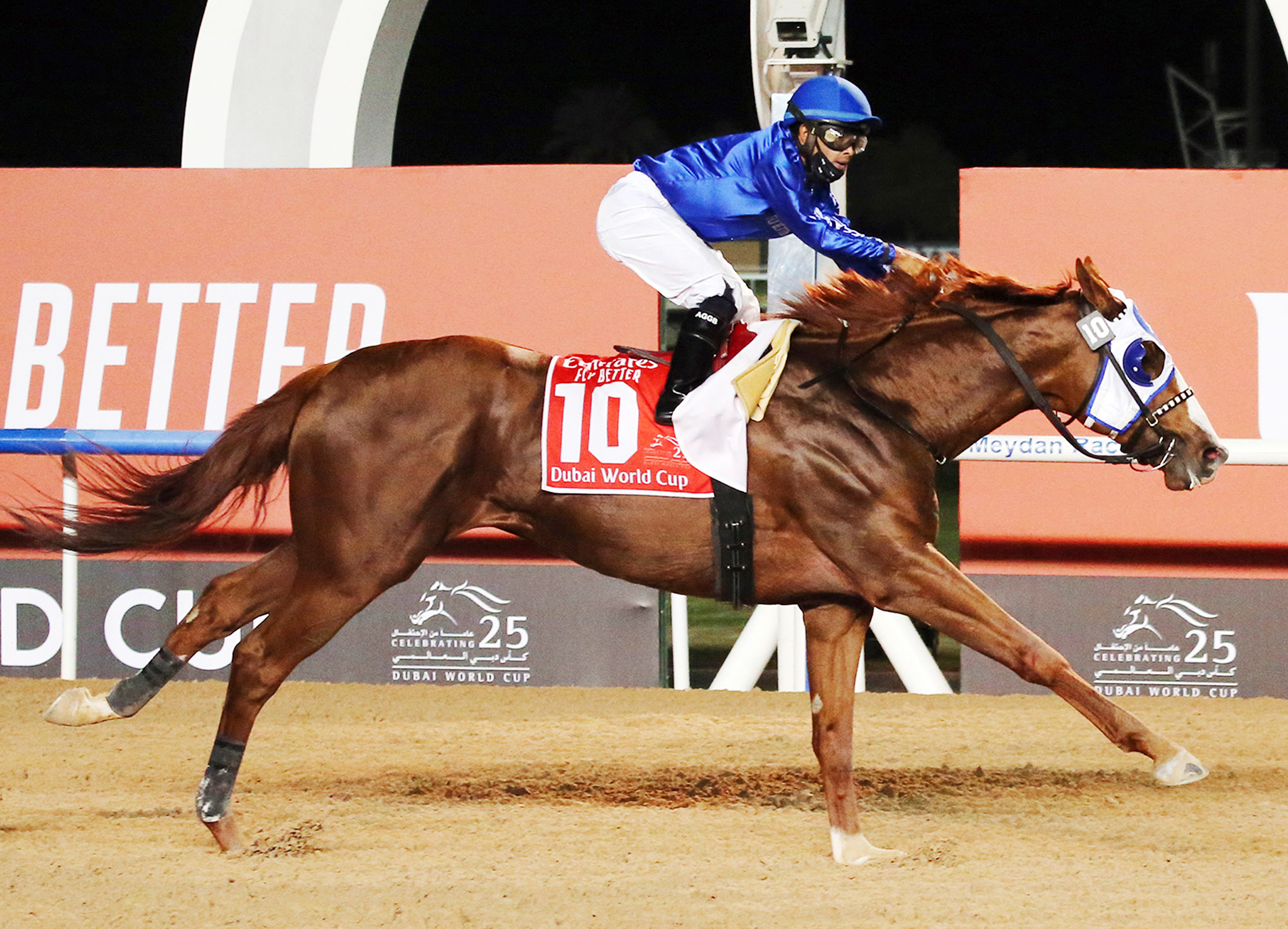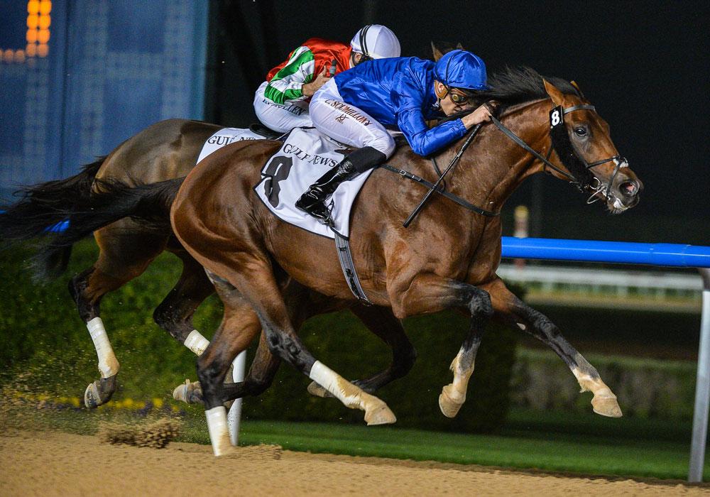 THUNDER SNOW (Helmet). Champion 3YO Dirt Miler in UAE in 2016-17. Champion Older Horse in UAE in 2017-18 & 2018-19 (Int.). 8 wins-2 at 2-from 1200m to 2000m, £135,518, €508,420, US$810,000, 54,866,500Dhs in GB, France and U.A.E, Meydan Dubai World Cup, Gr.1-twice, Chantilly Prix Jean Prat, Gr.1, Saint-Cloud Criterium International, Gr.1, Meydan UAE Derby, Gr.2, Al Maktoum Challenge Round 2 S., Gr.2, 2d Belmont Jockey Club Gold Cup, Gr.1, Irish Two Thousand Guineas, Gr.1, Meydan Al Maktoum Challenge Round 3 S., Gr.1-twice, 3d Deauville Prix Jacques Le Marois, Gr.1, Breeders' Cup Classic, Gr.1, Belmont Metropolitan H., Gr.1, Royal Ascot St James's Palace S., Gr.1.