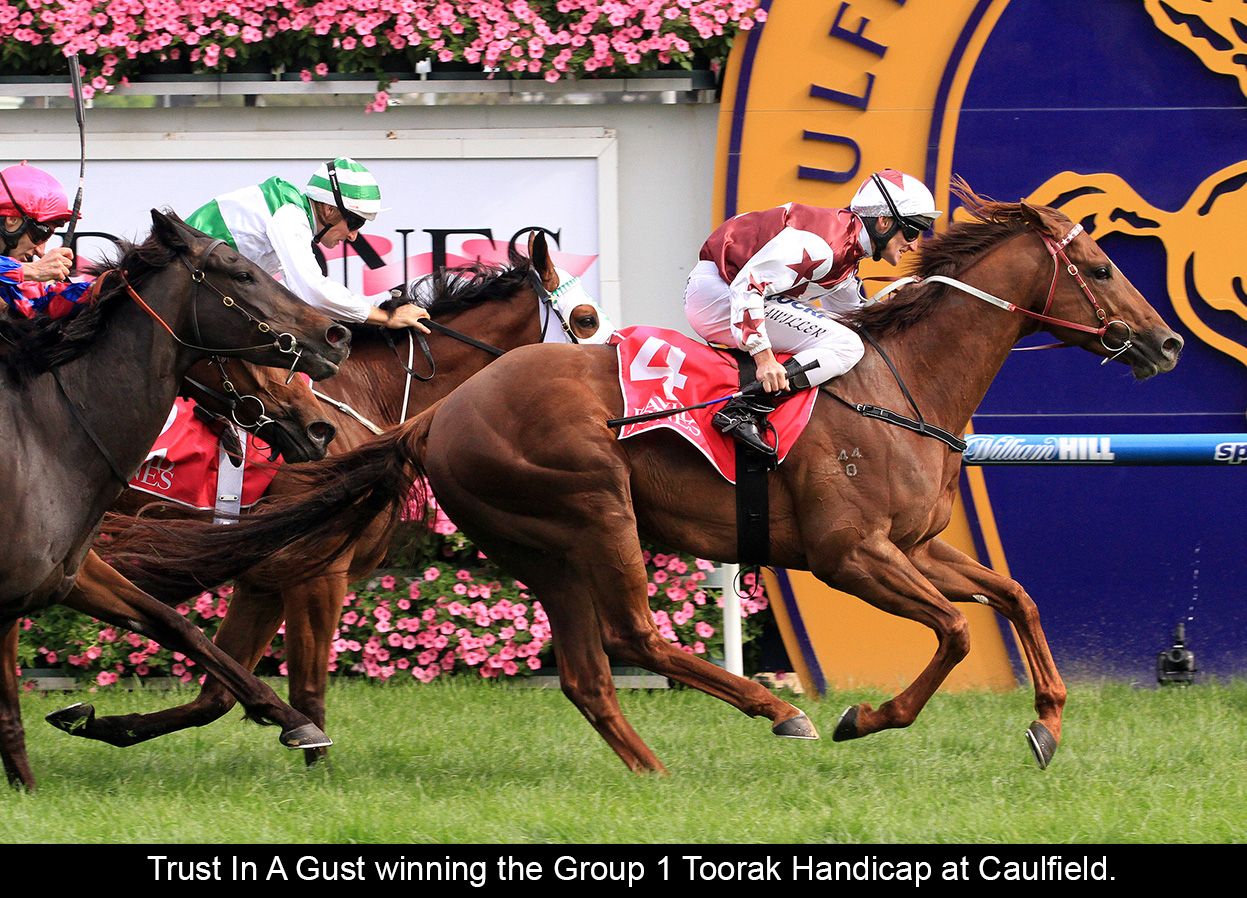 Dual Gr1 Winner:- TRUST IN A GUST (Keep the Faith). 10 wins from 1000m to 1600m, A$1,170,150, MRC Sir Rupert Clarke S., Gr.1, Toorak H., Gr.1, Harris Walker Gold Carat, Le Pine Funerals H., MVRC Chandler Macleod S., Ballarat TC Thomas Jewellers Gold Eureka Stockade, MVRC Jeep Don't Hold Back H., 2d MVRC Chandler Macleod S., L, VRC VOBIS Gold Reef S., MRC VOBIS Gold Sprint, Bendigo JC VOBIS Gold Rush 2YO S., 4th MRC Gothic S., L. Sire.