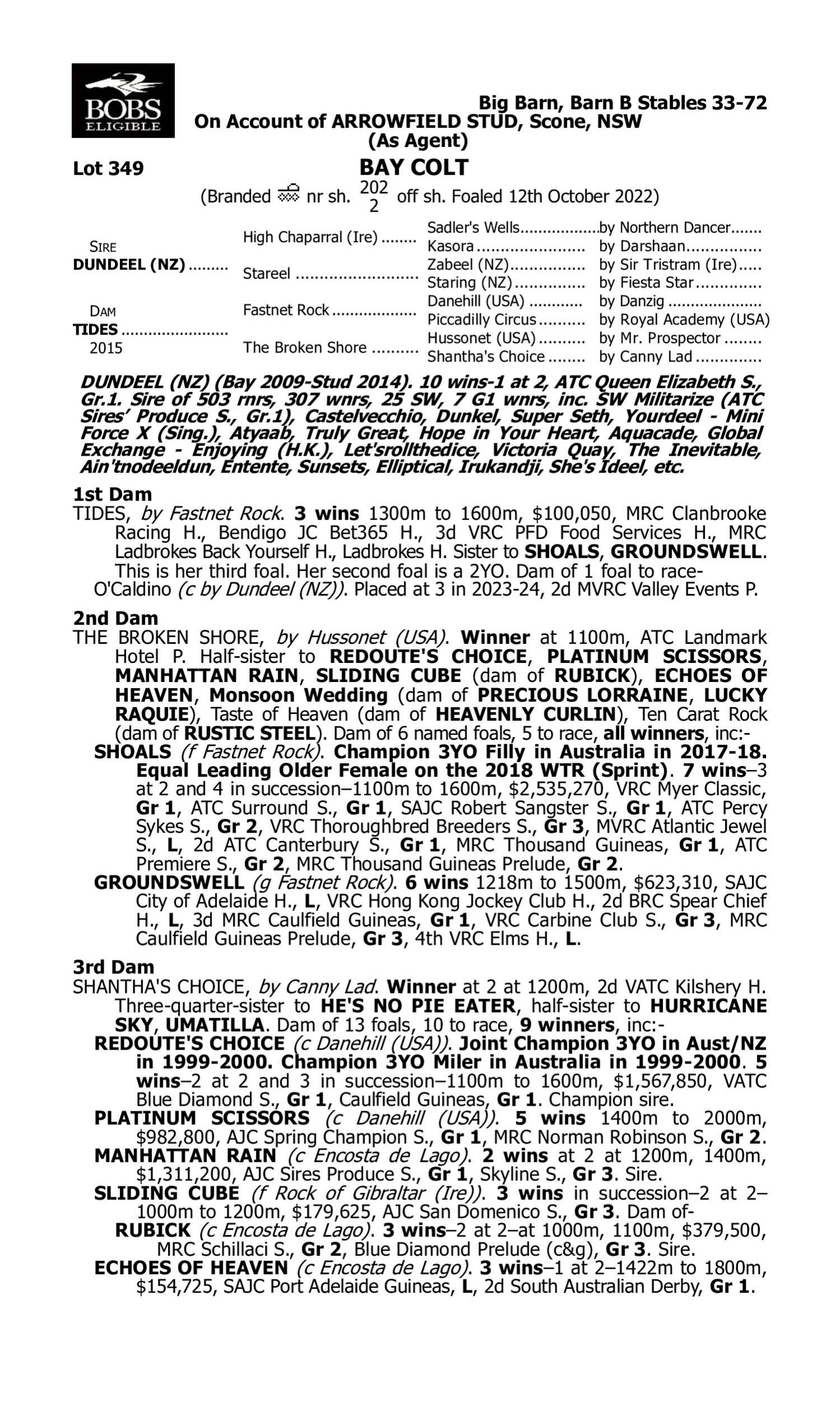 Lot 349 DUNDEEL x TIDES Colt – TIDES won 3 races but no stakes races and was not stakes placed.