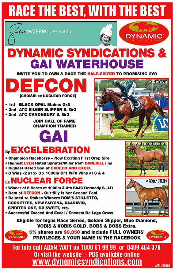 Since we purchased our filly, DEFCON won the Gr3 BLACK OPAL and our filly has almost doubled in commercial value.