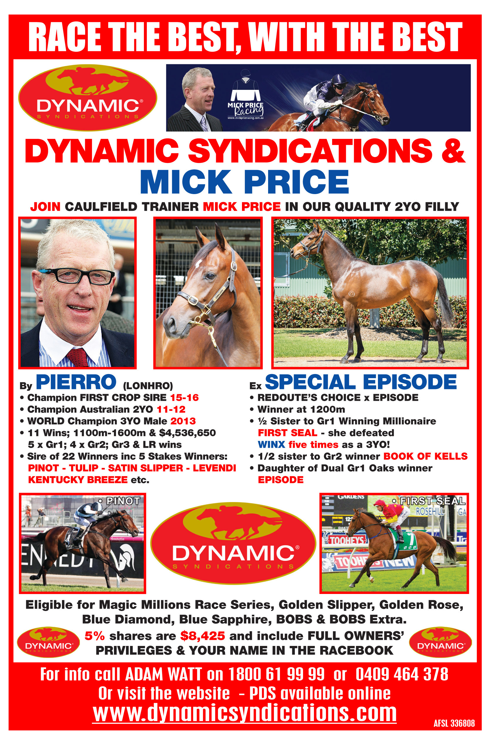 Contact Dynamic Syndications and chat to Adam Watt about our spectacular half-sister to TELEPLAY and our filly is by PIERRO - the HOTTEST SIRE in AUSTRALIA.