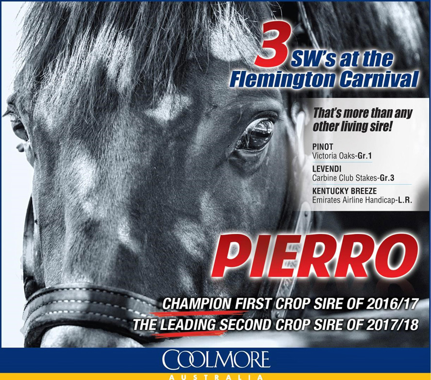 PIERRO has just sired 3 Stakes winners over the VRC Carnival - PINOT (VRC OAKS), LEVENDI (Carbine Club), KENTUCKY BREEZE (Emirates Hcp LR), they join fellow Stakes Winners: TULIP and SATIN SLIPPER