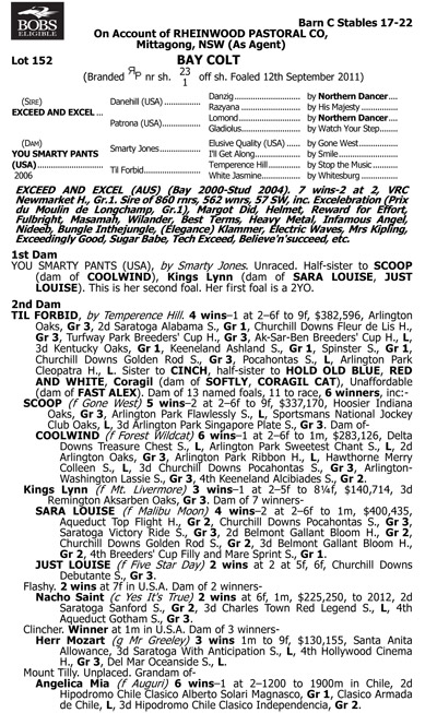 The Dam, YOU SMARTY PANTS, is an extremely well related unraced US mare that is a half-sister to well performed 2yo and dual stakes winner, SCOOP. Also featuring on his pedigree page are other US stakes winners including COOLWIND, SARA LOUISE and JUST LOUISE with the stakes placed KINGS LYNN, NACHO SAINT, HERR MOZART and ANGELICA MIA also in his pedigree. With a total of seven individual two year old winners listed within his first two dams, he is sure to have speed from a young age.