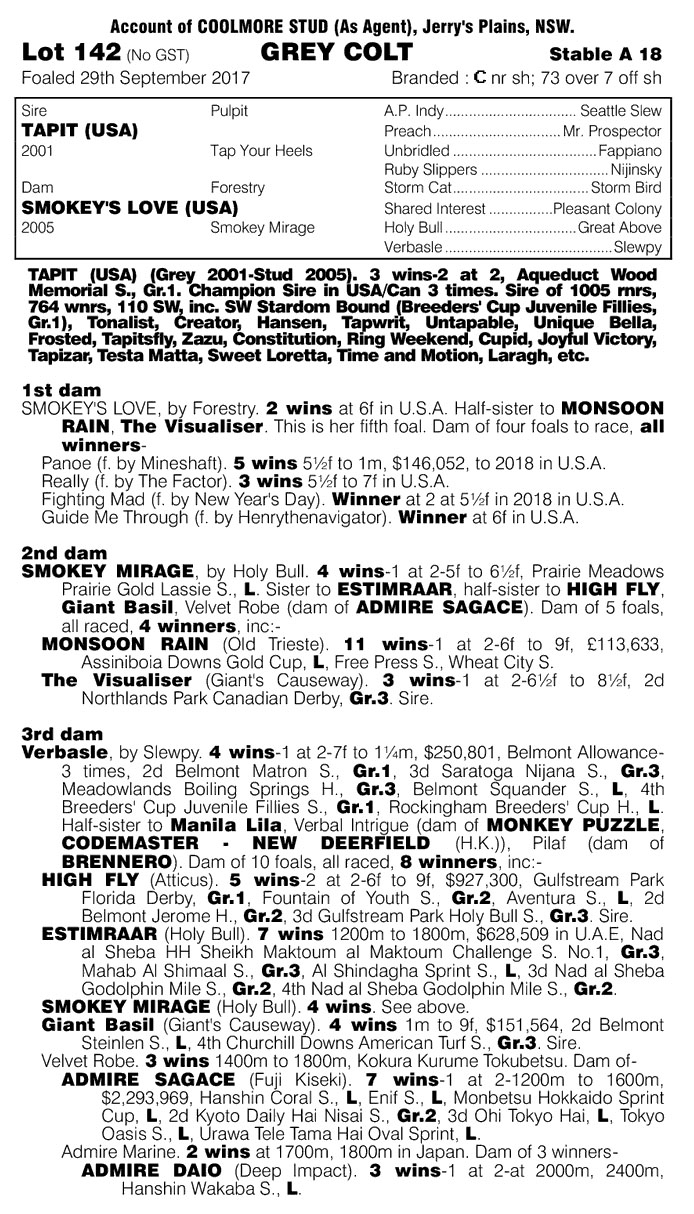Lot 142 $110,000 + GST TAPIT ex SMOKEY’S LOVE Grey Colt (Coolmore)