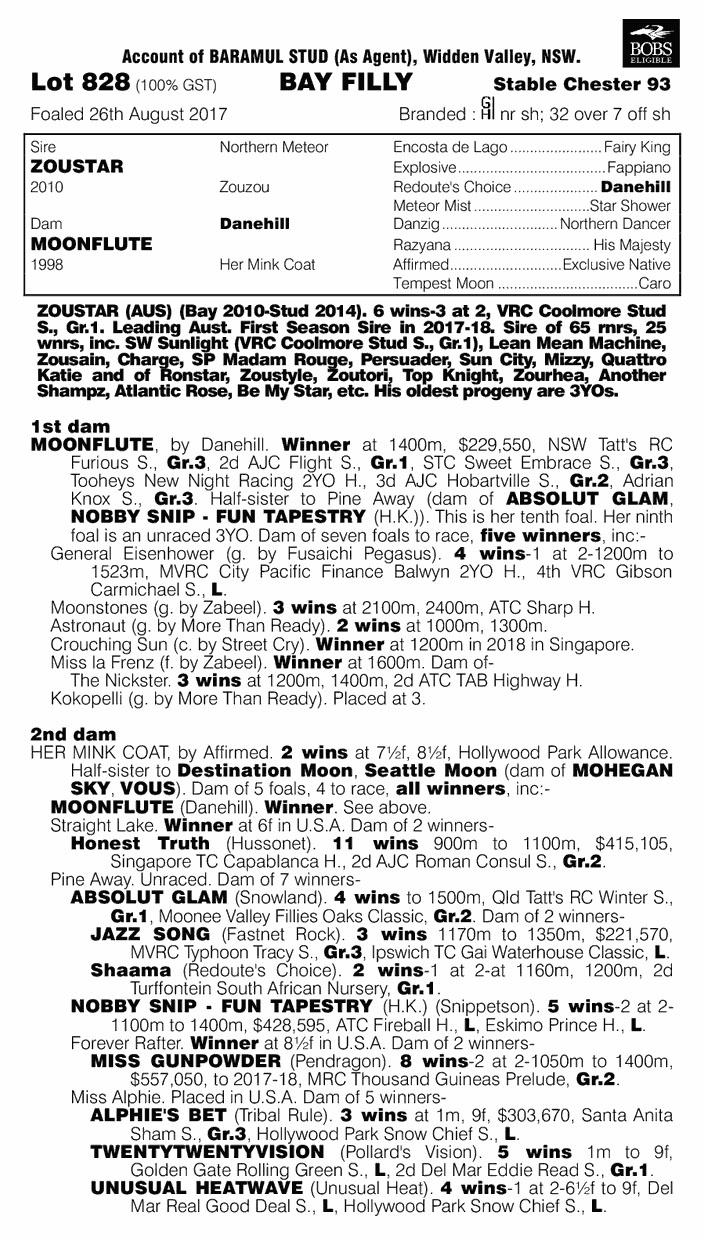 Lot 828 $150,000 + GST ZOUSTAR ex MOONFLUTE Bay Filly (Baramul / Gerry Harvey)