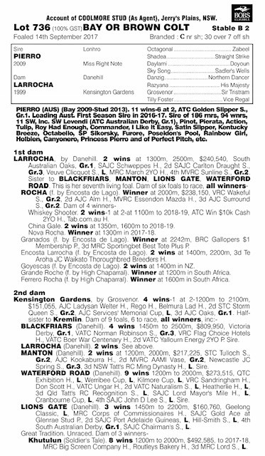 Lot 736 $100,000 + GST PIERRO ex LARROCHA Bay/Brown Colt (Coolmore)