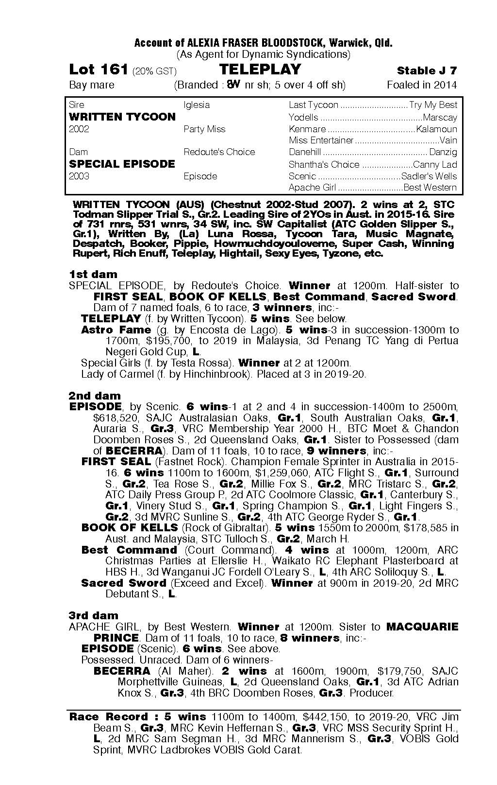 Despite several expressions of interest from leading commercial breeders to buy her privately, a decision was made by the owners to offer Teleplay for sale at public auction as a racing / breeding prospect ahead of the 2020 breeding season.