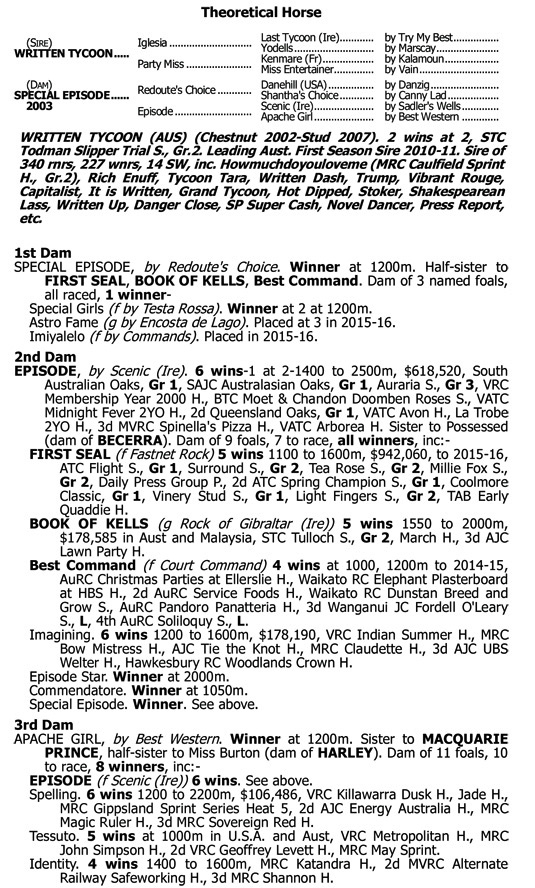 SPECIAL EPISODE is also a Half-Sister to BOOK OF KELLS (g Rock of Gibraltar (Ire)) 5 wins 1550 to 2000m, $178,585, inc STC Tulloch S., Gr 2.