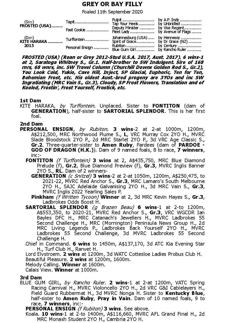 Dynamic Syndications also purchased a gorgeous Grey Filly by FROSTED from KITE HARAKA also with Ciaron Maher Racing Stables. (Sold Out)