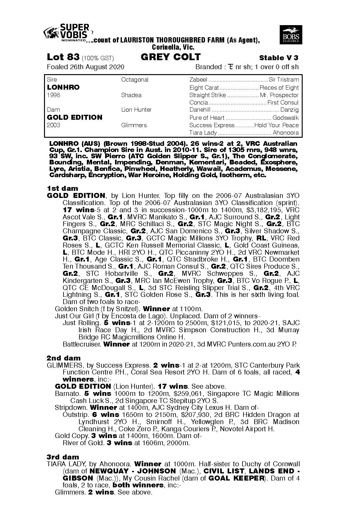 We also purchased a lovely colt by LONHRO from champion racemare GOLD EDITION for $150,000 + GST and he has entered the Ciaron Maher Racing Stables. (Sold Out)