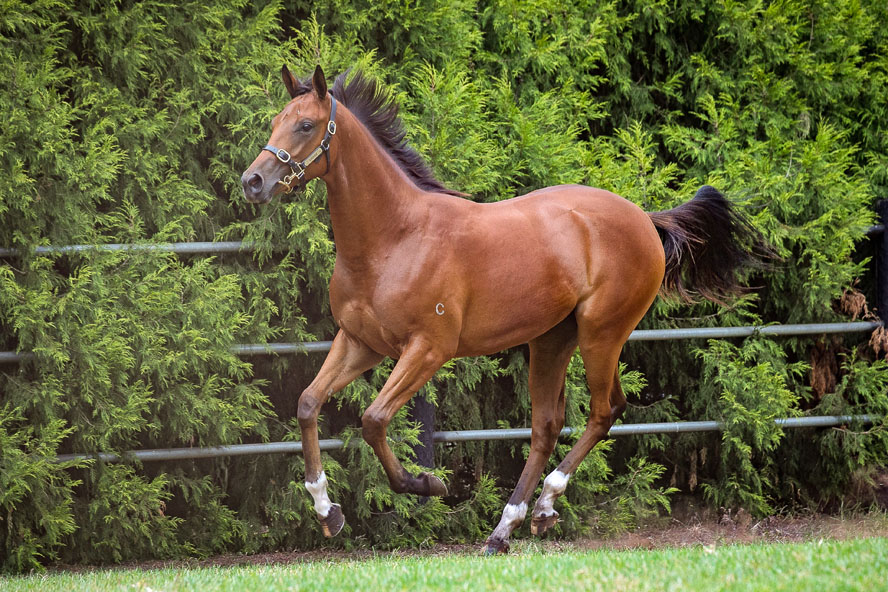 Our Yearling Filly by Excelebration x Polite running in the paddock