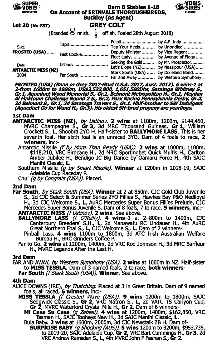 The fact he was from an extremely talented broodmare ANTARCTIC MISS (NZ), who was a Gr3 Winner and Gr1 placegetter was a significant advantage on its own but even more important was that genetically, this mare worked extremely well with her mated sire – Darley’s very exciting First Crop Sire FROSTED (USA), the FASTEST and BEST Son and sensational three time Gr1 Winner by America’s own Champion Sire - TAPIT.