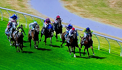 Quickly FIRST THOUGHT responded and Jake was forced to bide his time, as the field began its swing into the home turn, it was vital not to get there too quickly and become a sitting target for the chasers.
