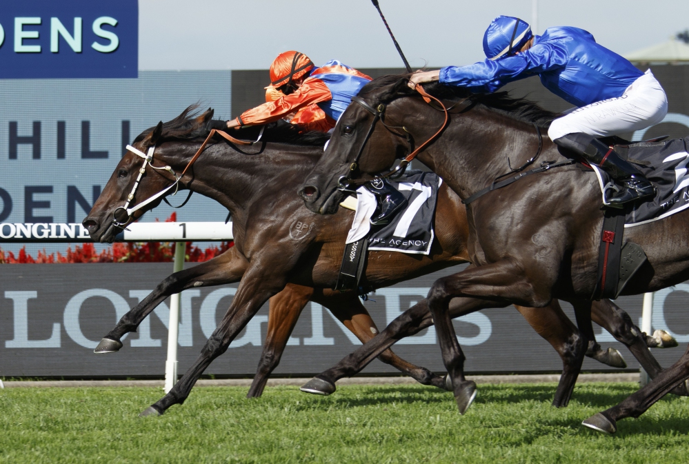 THINK IT OVER (Orange Cap) fights hard to win George Ryder Gr1 becoming the sire's 7th Group 1 Winner