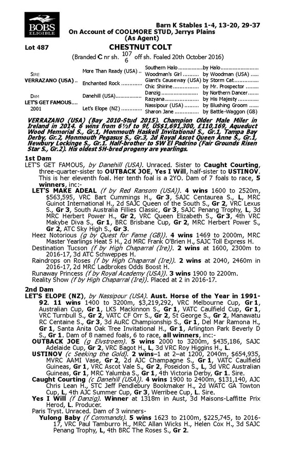The 2nd Dam LET’S ELOPE – was Australian Horse of the Year. She won 11 races, including 4 Gr1 wins: Melbourne Cup, Caulfield Cup, Australian Cup and LKS Mackinnon Stakes.