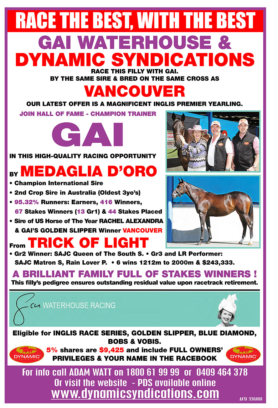 Dynamic Syndications and Gai combined at the Inglis Melbourne Premier Yearling Sale to purchase a stunning yearling filly by the stallion MEDAGLIA D’ORO from the Group 2 Winner TRICK OF LIGHT – a grand-daughter of Danehill.