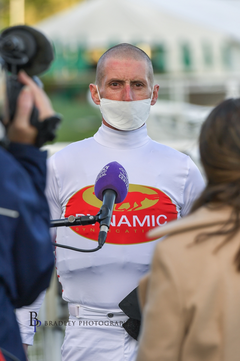 Post-race a happy trainer grinning beneath his COVID mask like a Cheshire cat was interviewed by