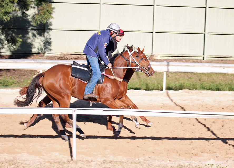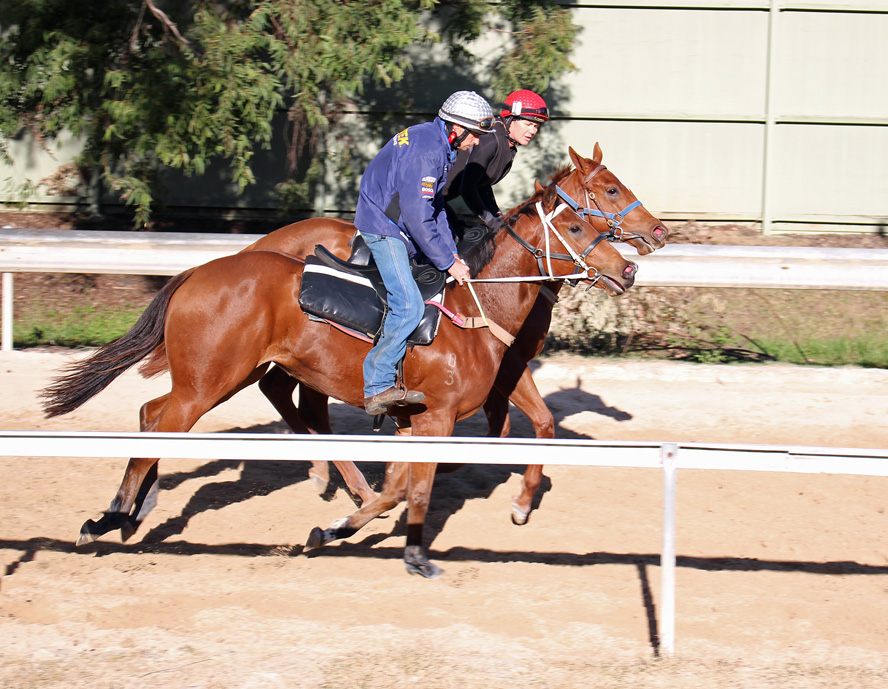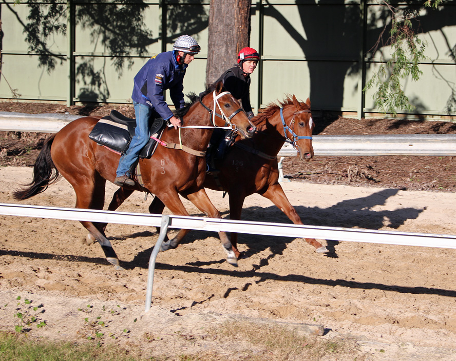 OUR FILLY returning after exercise gallop - right of picture - Silver Cap / Blue Jacket