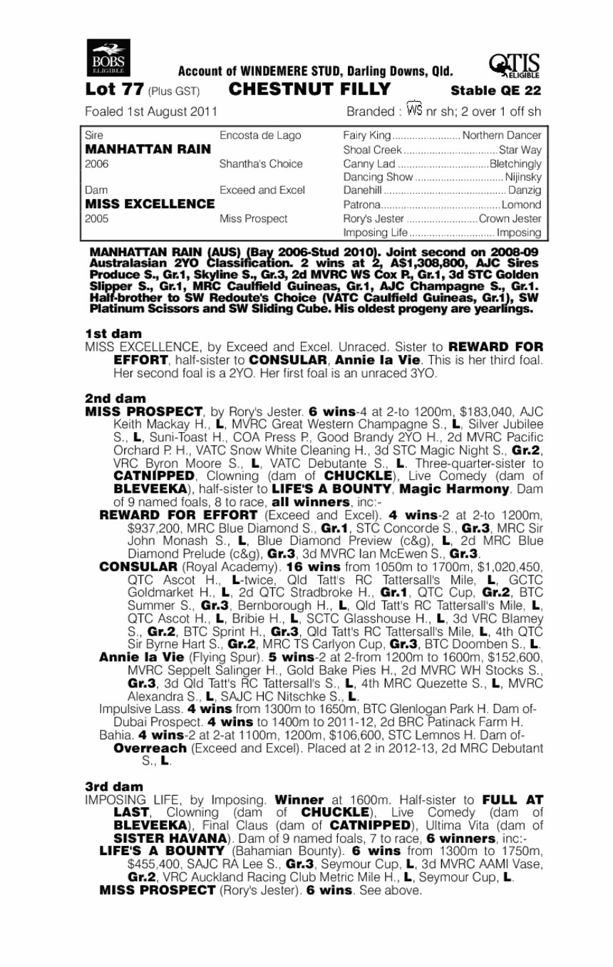 Here is a first look at LOT 77, our own MANHATTAN RAIN - MISS EXCELLENCE filly!