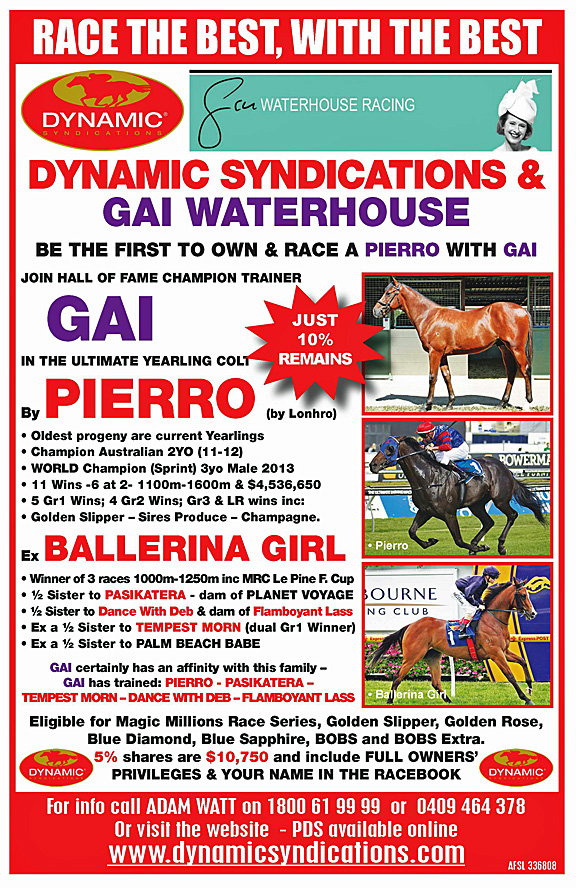 Dynamic Syndications purchased a son of PIERRO from the Danehill Dancer mare BALLERINA GIRL at the Magic Millions Yearling Sales in January this year.
