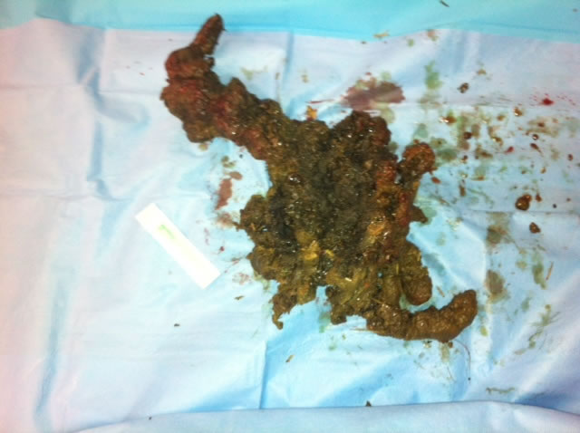 This foreign matter was removed from the colon of the filly. It was identified as a fibrous solid that had become compacted in the colon and unable to be passed through the horse’s digestive system. It was thought to be either a length of hay net or hay bailing twine or a piece of torn horse rug that the horse had swallowed anywhere from 6 to 18 months earlier which had become caught and compacted with gravel stones and waste by-product. It had eventually become so large nothing was passing through the filly’s system and had started to turn septic.