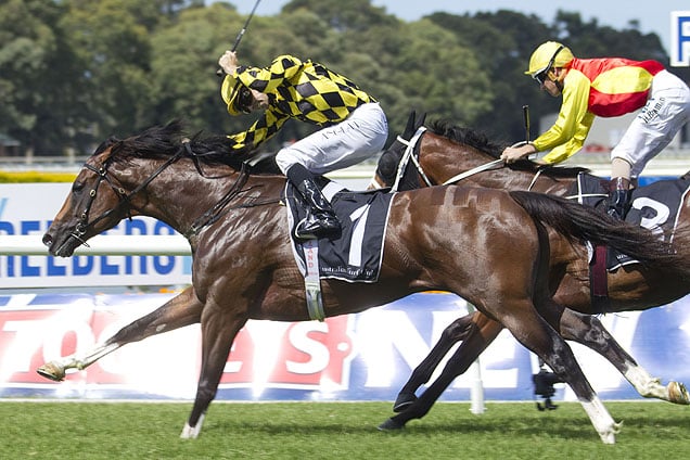 GIGA KICK in Jonathan Munz famous colours winning the Gr1 All Aged Stakes