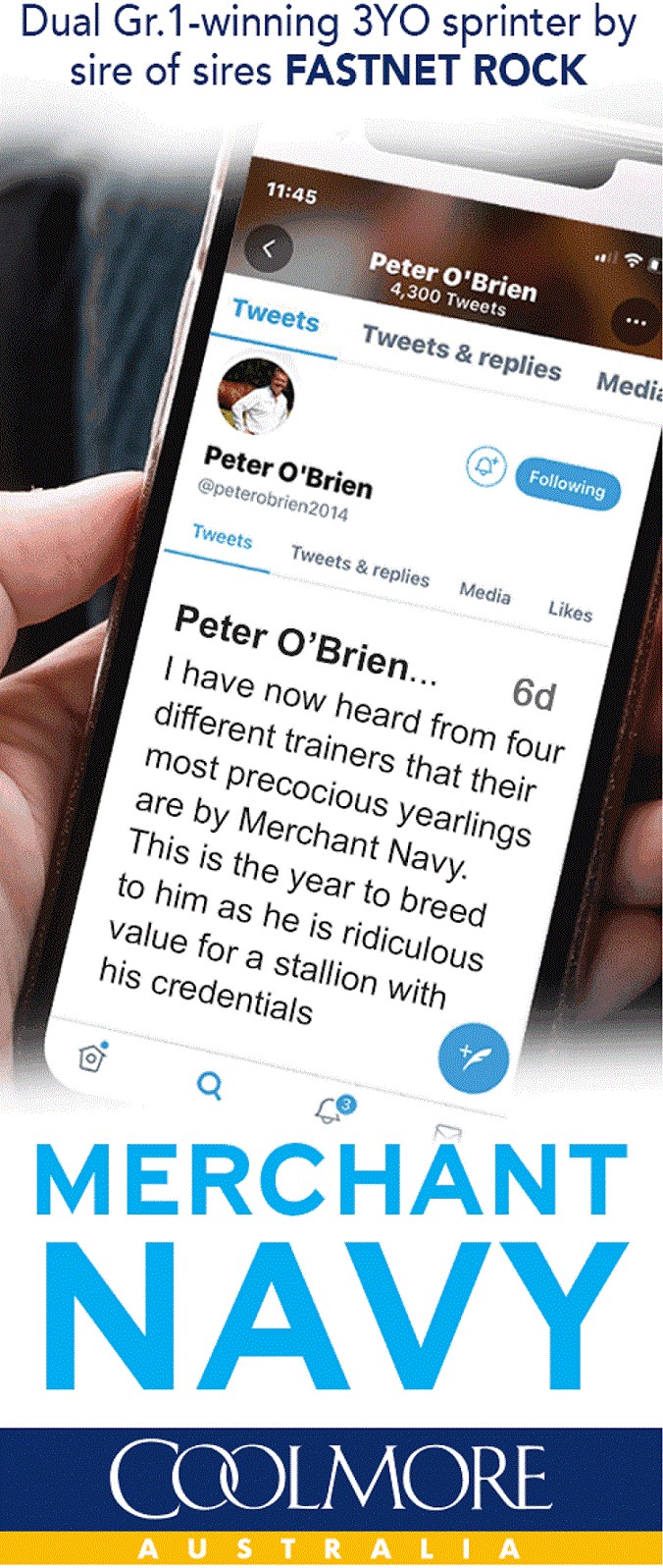 “The 1200m dash down the Flemington straight has long been considered a sire making race …Merchant Navy added his name to the honour roll in Saturday’s Coolmore, taking his place in history in spectacular fashion: weaving a passage over the final 100m to catch tearaway leader, Invincible Star, right on the wire. Even better still for connections, Merchant Navy has the pedigree to match his talent for speed.” - www.aushorse.com.au, November 6, 2017