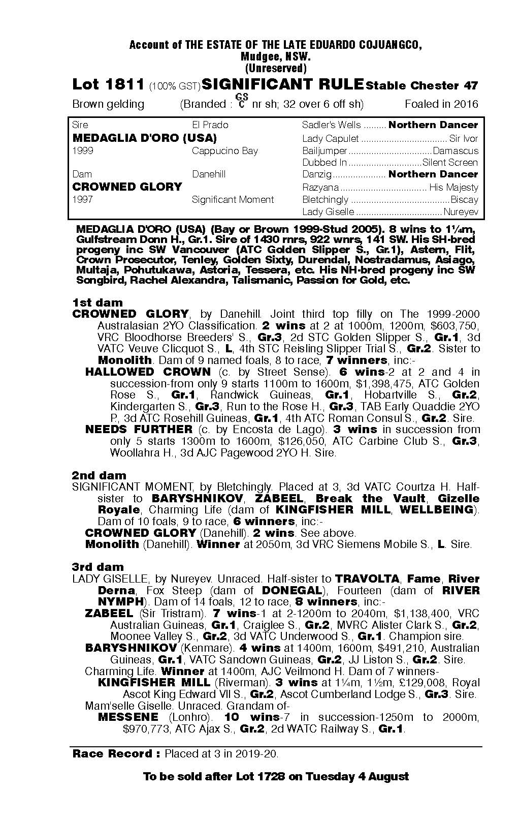 SIGNIFICANT RULE (MEDAGLIA D’ORO x CROWNED GLORY) just turned a 4yo on the 1st August and represents sensational racing opportunities.