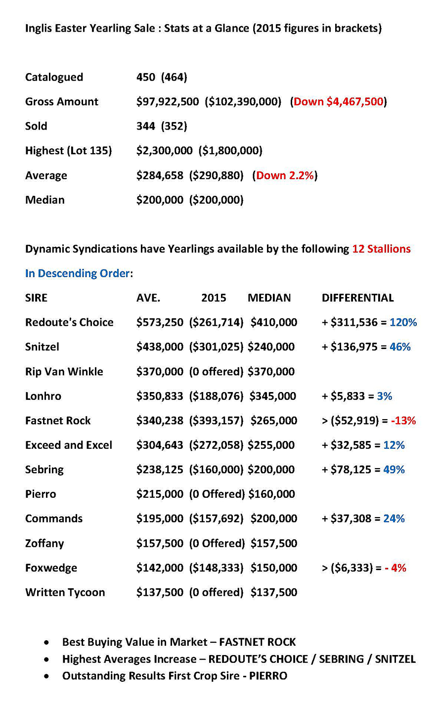 With a review of the sale data below from the 2016 Inglis Australian Easter Yearling Sales, it truly identifies the great value we have available for our clients with these horses being trained by the Best of the Best: GAI WATERHOUSE, MICK PRICE and GERALD RYAN.