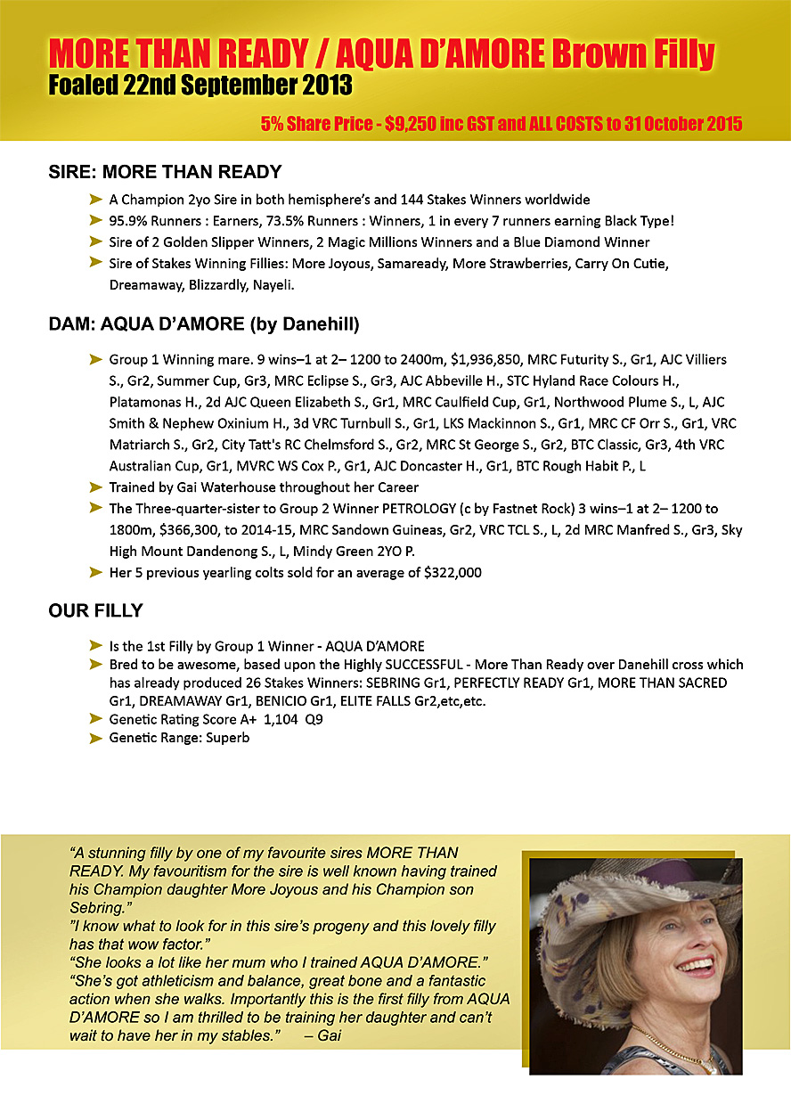 Dynamic Syndications are currently offering a magnificent filly by MORE THAN READY from the Champion race mare AQUA D’AMORE (by Danehill).
