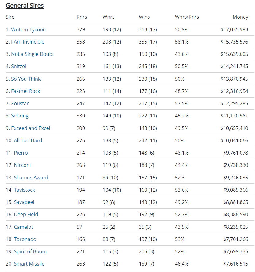 Written Tycoon captured his first title as Australia’s Champion Sire by Earnings.