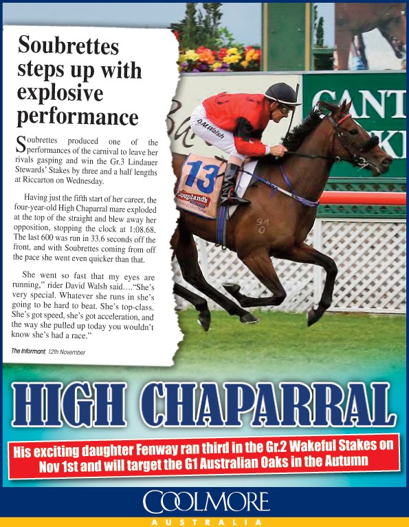 Champion Stallion High Chaparral has another outstanding prospect on his hands in the form of New Zealand mare Soubrettes whom demolished her opposition by a widening 3.5 Length margin in the Group 3 Lindauer Stewards Handicap Wednesday.