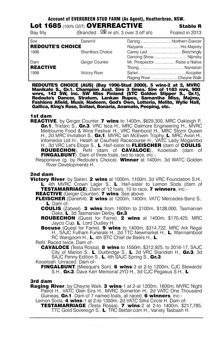 OVERREACTIVE is by REDOUTE’ CHOICE ex REACTIVE (by Geiger Counter). REACTIVE was a Gr1 Winning Sprinter who won the MRC OAKLEIGH Plate.